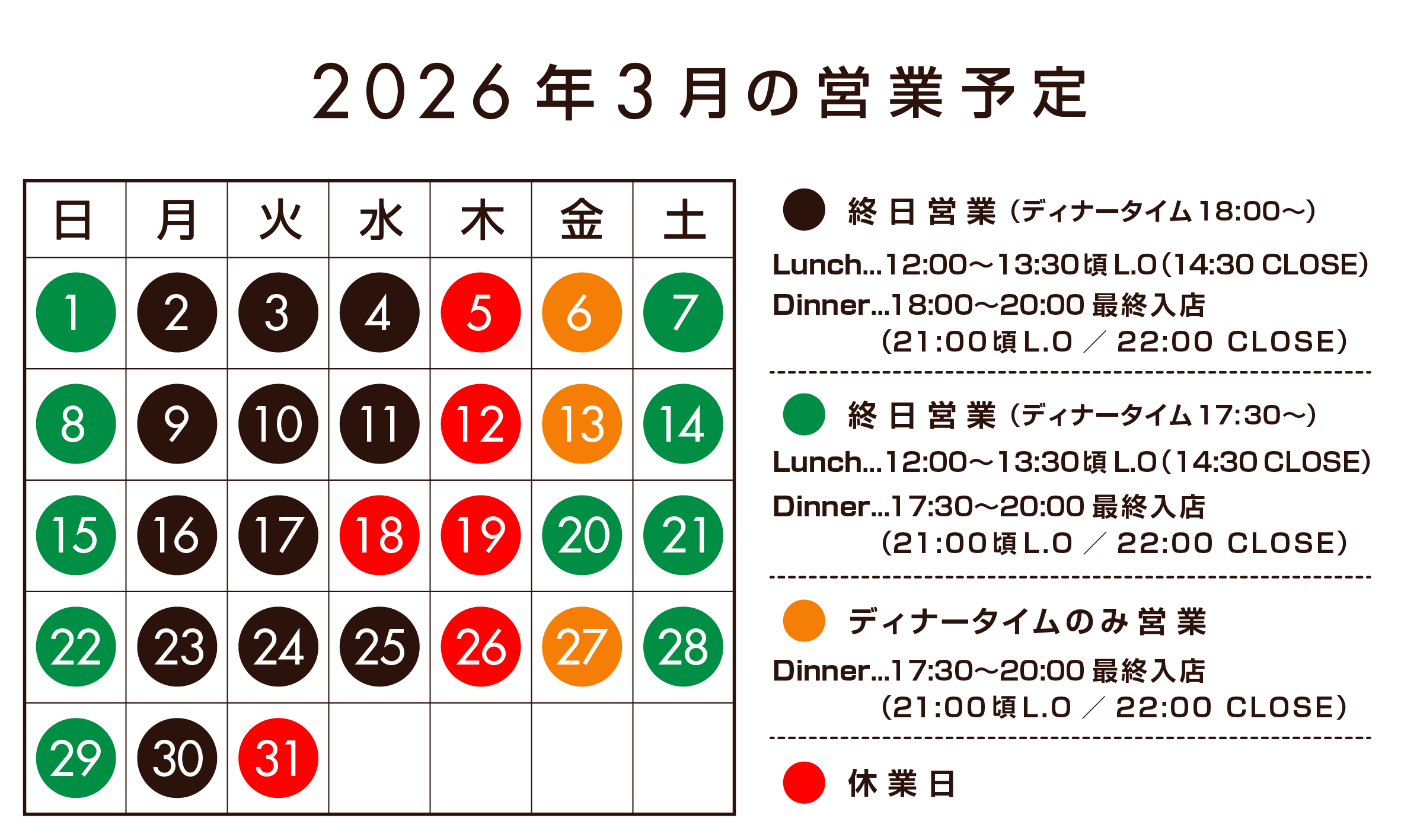 状況によりその他不定休もございますので御来店の際は